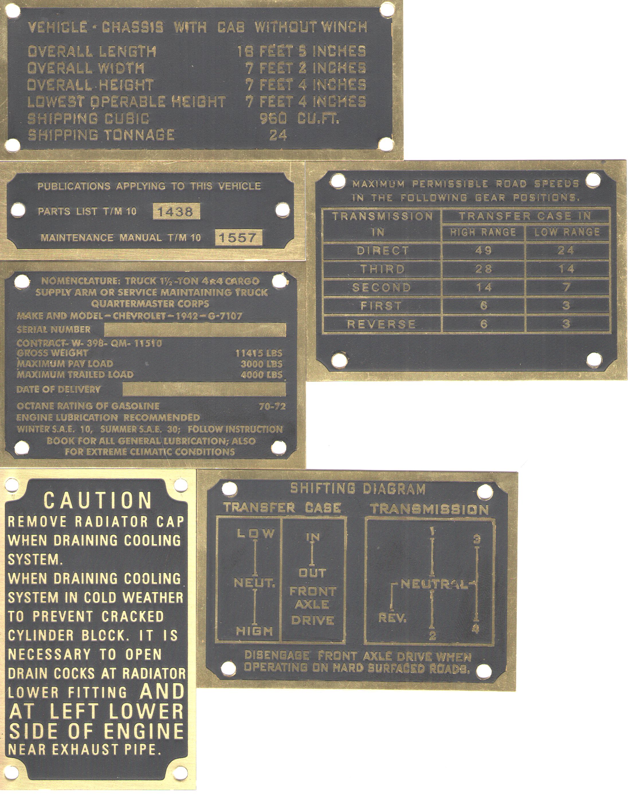 I don't know anything about the Chevy plates, and the only TM I have is the TM9-805 and that is from 1943. The TM10-1557 is on the data plate.