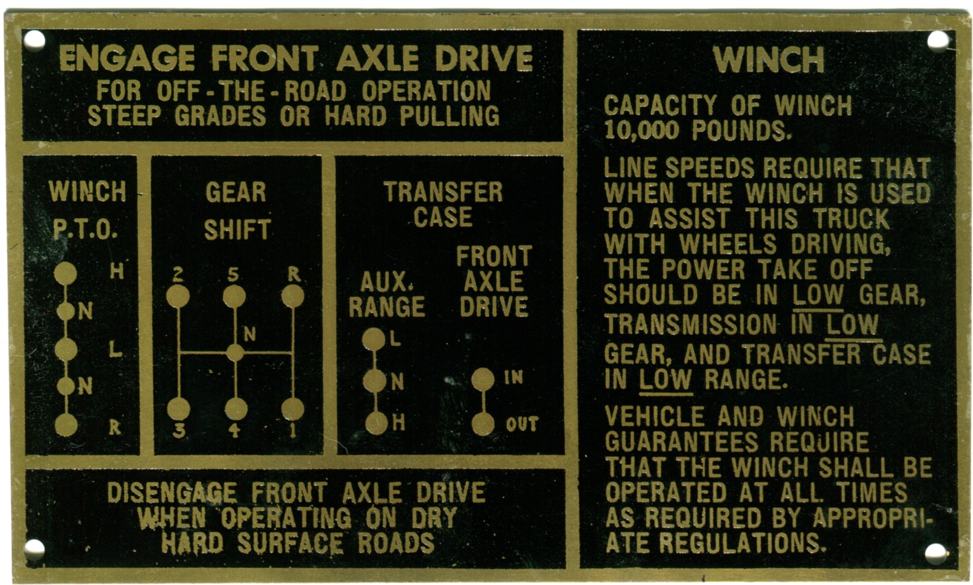 Ok, I got an NOS (yes, I held the package in my hands and read the parts tag... kicking myself for not having my camera) brass data plate (the shift plate for a CCKW with winch.
