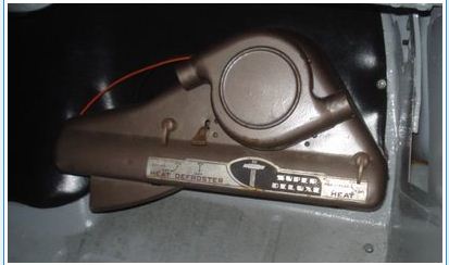 The heater that killed the Military style heater. Defroster, baffeled, smaller. This model would evolve into the later 'fresh air' type heaters