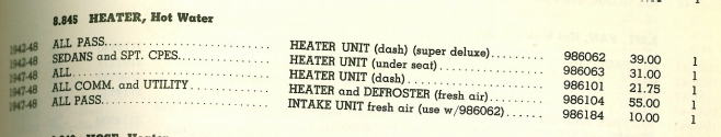 My 1948 Chevrolet Master parts list also lists one "Super Deluxe" hot water Heater Unit for 1942-48 All Passenger cars, part number 986062.