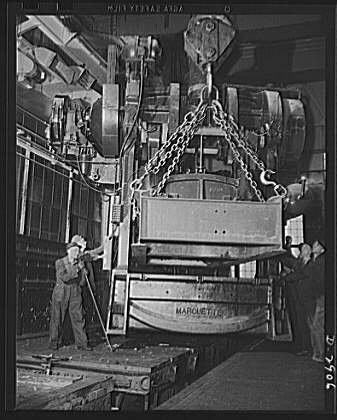 Conversion. Automobile plant. A thirty-eight-and-a-half-ton Bliss Marquette No. 40 1/2-84 press, removed from a building that is being entirely cleared and converted to other war production, is lowered to a flat car for shipment to its new location. There it will form hood sides for 4 x 4 and 6 x 6 army trucks. The large I-beam spans placed through the die opening save dismantling and permit two cranes to share the weight, thus permitting quicker removal. Chevrolet Motor, Detroit, Michigan