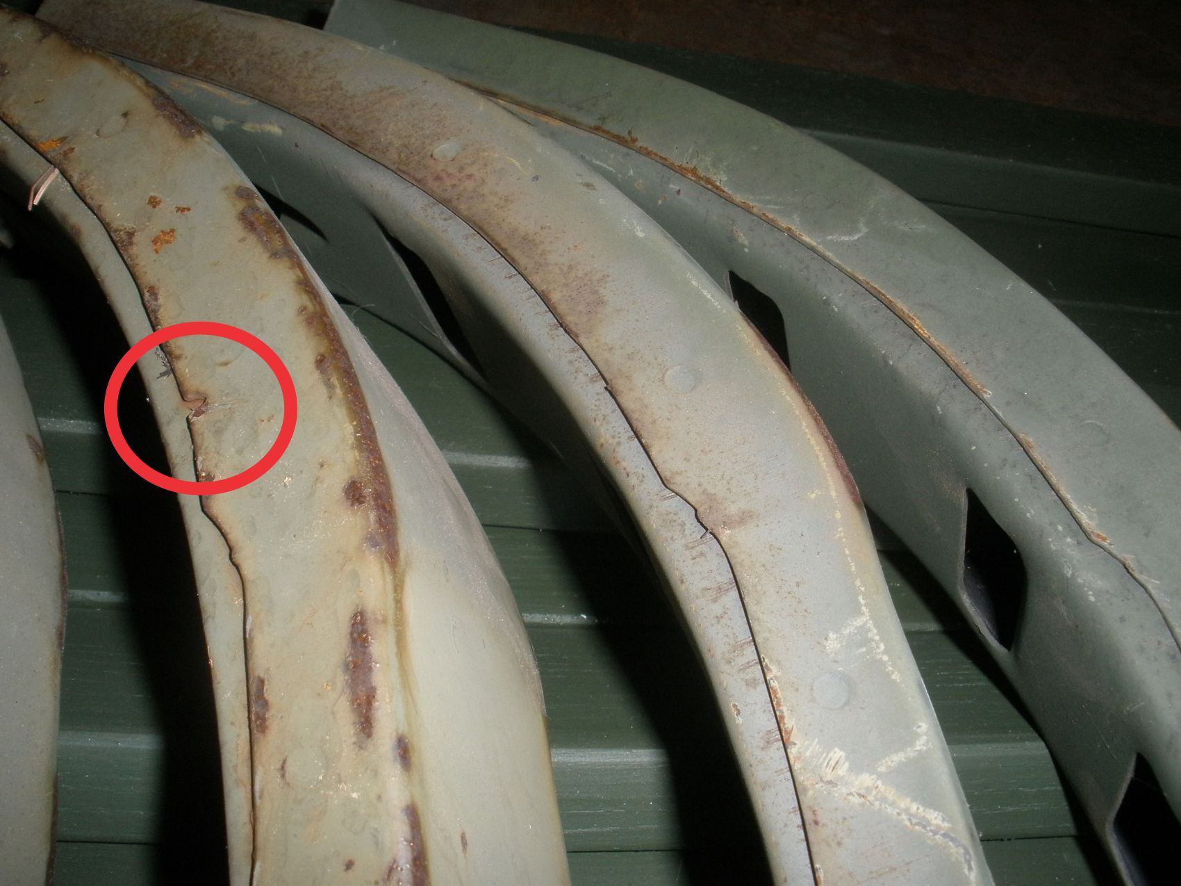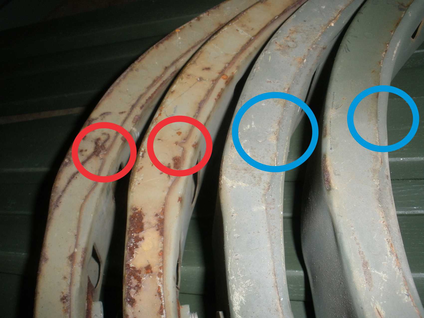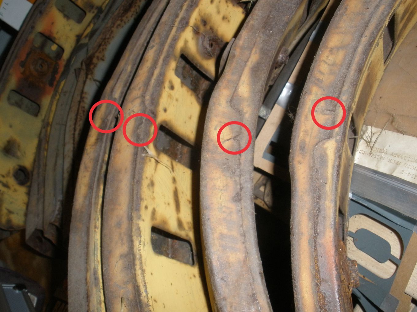 So, in this picture shows four bow corners. The two on the left are off a CCKW and the two on the right are off the M35A2. Note the notches in the red circles. I believe that these are the tells for a WWII era bow. Note that the two bows on the right are physically larger. That could be due to wear and use, but there is a physical size difference also.