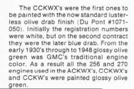 "The CCKWX's were the first ones to be painted with the now standard LUSTERLESS OLIVE DRAB finish (Du Pont #1071-050)." Emphasis added by me...