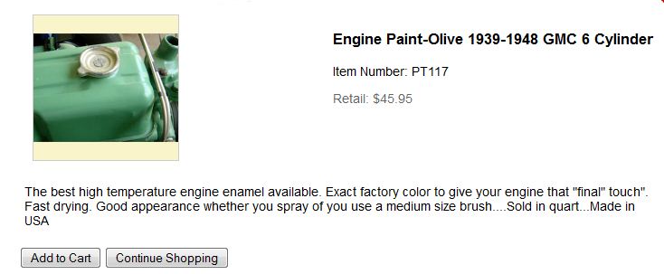The paint available from online restoration shops billed as: Engine Paint-Olive 1939-1948 GMC 6 Cylinder IS THE CORRECT COLOR.