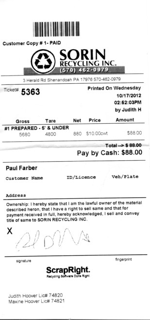 | 10/17/12 | Scrapped 880Lbs #1 Steel | +88.00 | -18.95 |