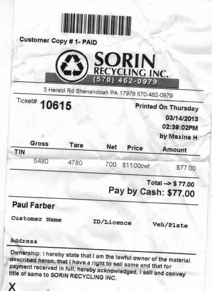 | 11/21/13 | Scrapped 720lbs #1 Steel | +79.20 | 24.19 |